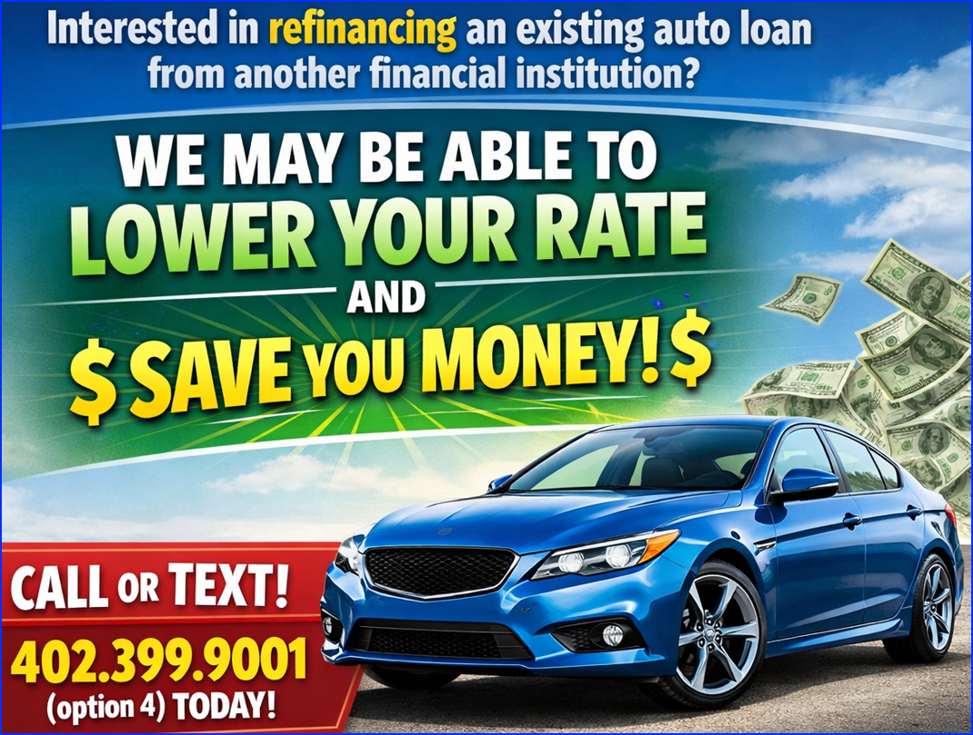 Stop by, call or text 402.399.9001 (option 4), or learn more about our Auto Loans, please click here.