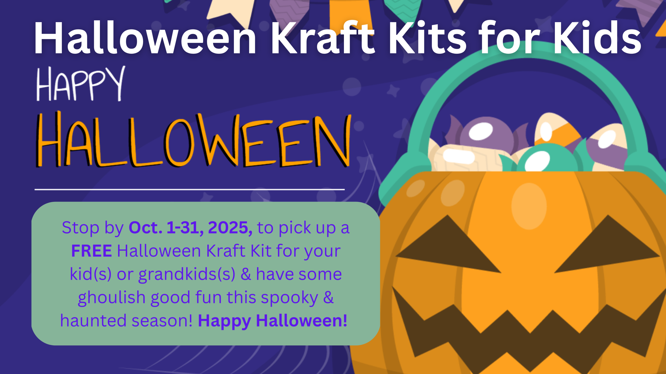 Stop by Oct. 1-31, 2025, to pick up a Halloween Kraft Kit for your kid(s) or grandkids(s) and have some ghoulish good fun this spooky season!
