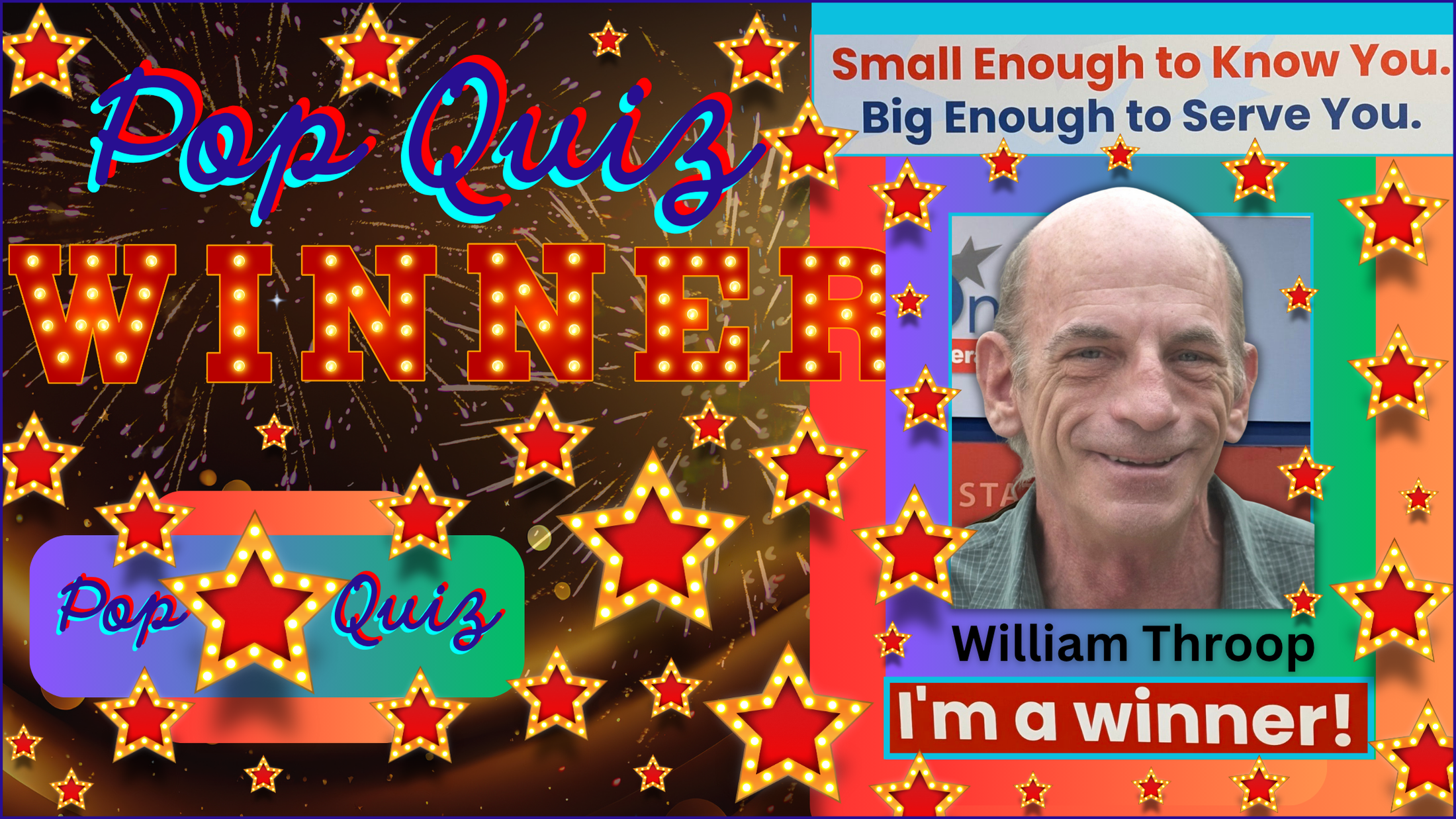 OFCU member William Throop was the first person to email the correct Pop Quiz answer for last month’s e-newsletter $20 Amazon Gift Card giveaway! CONGRATULATIONS, WILLIAM!