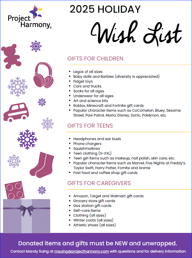 *Note: For the health and safety of the children served, Project Harmony asks that all donations be NEW, UNUSED and in their ORIGINAL PACKAGING.